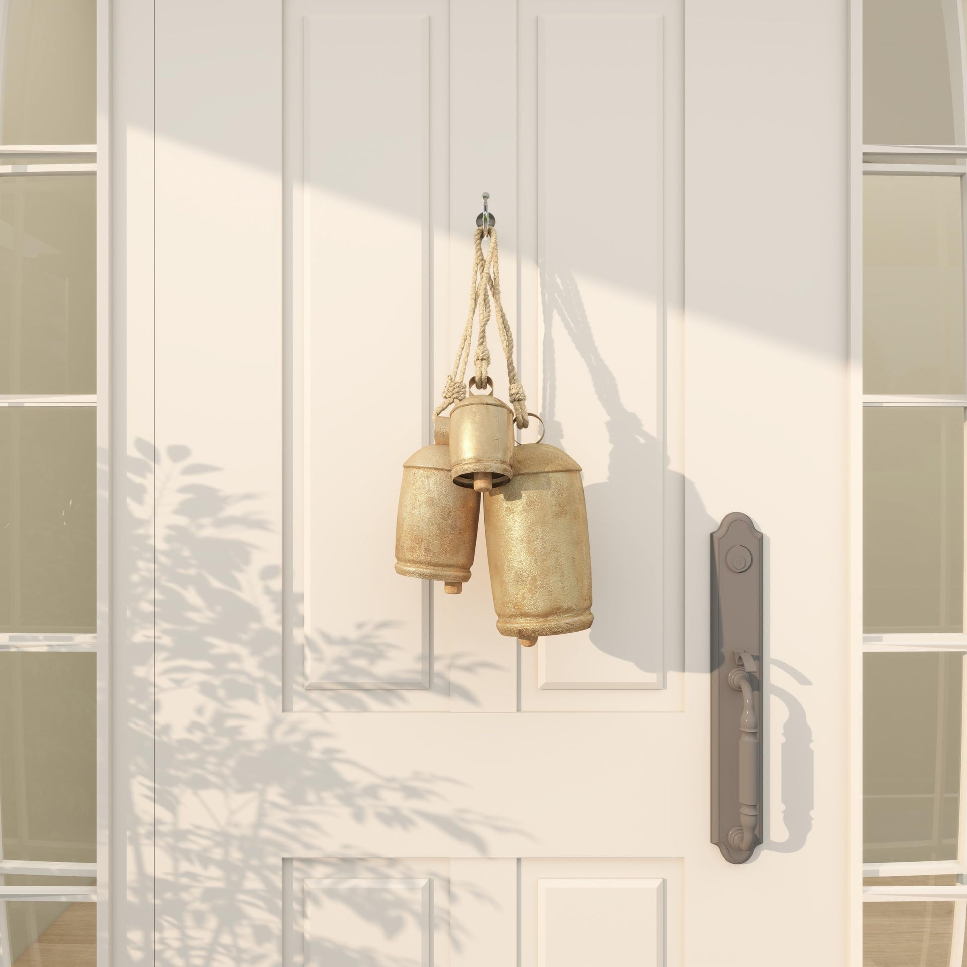 Add rustic charm and melodic flair to your home with this Set of 3 Gold Decorative Hanging Bells. Crafted from metal with jute rope, each bell features a satin gold finish and a working clapper for a subtle, charming sound. Perfect for doorways, hallways, kitchens, or as year-round décor, this set adds warmth, texture, and visual interest to any space.