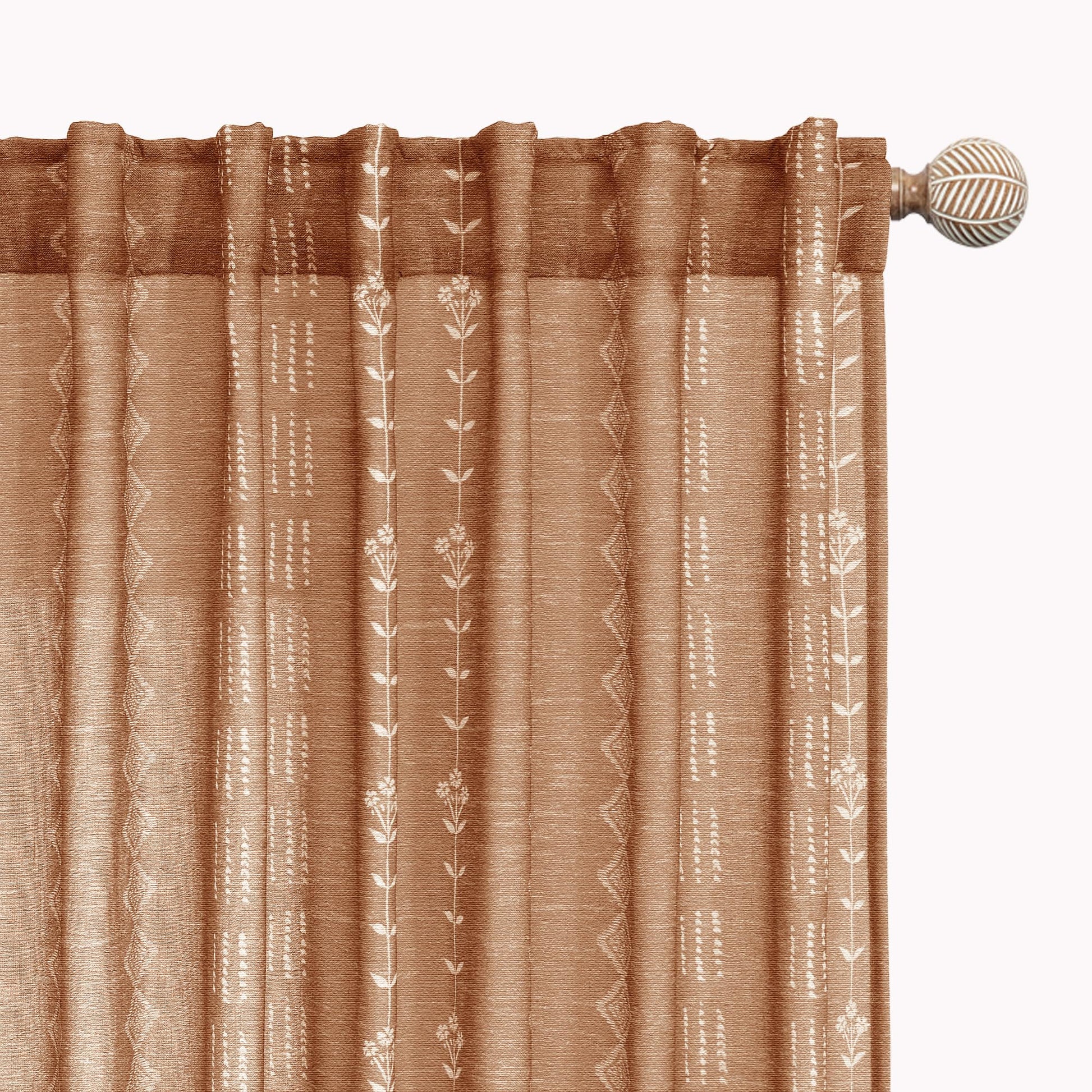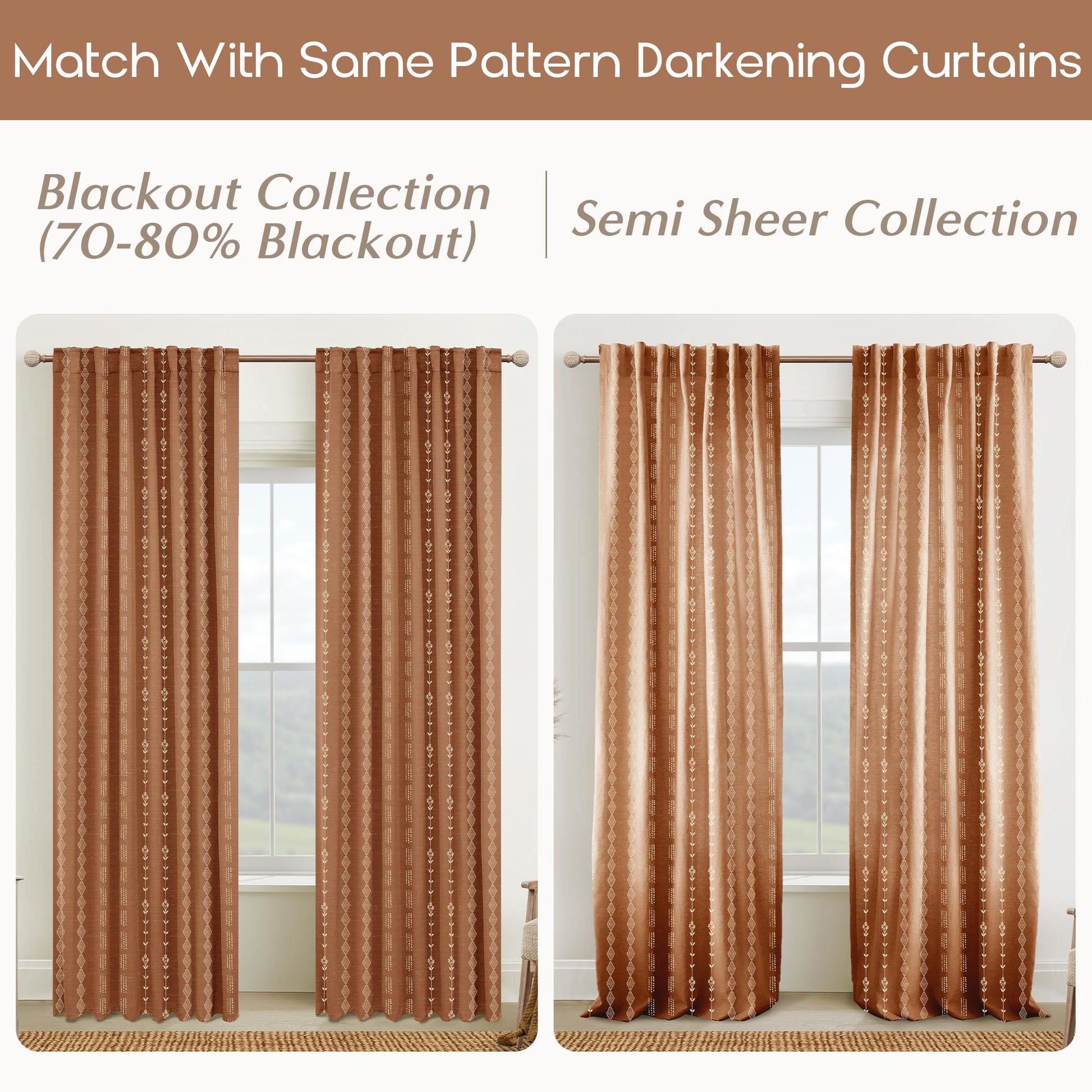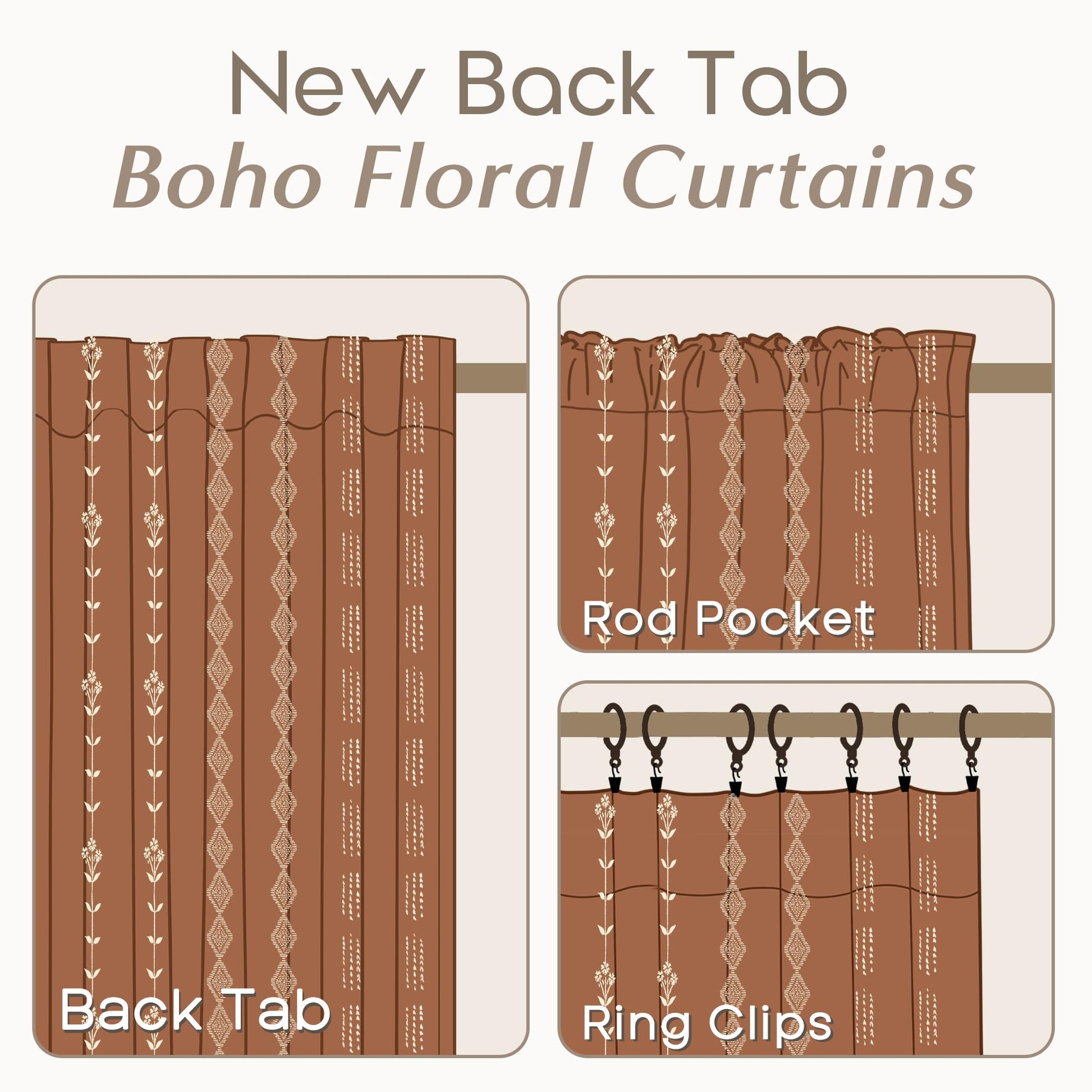 - Upgraded Boho Curtains: We hear our customers voice and adjust the grommet top to back tab curtains which feels more seamless creating soft pleated curtains look. ALSO we adjust the pattern a little bit featuring classic traditional boho DIAMODN design with floral botanical vines for a more boho-chic vibe.